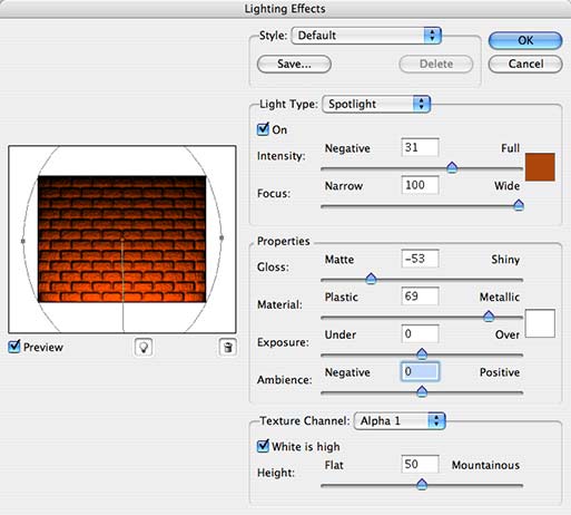 Choose Filter>Render>Lighting effects (Enter the settings shown)