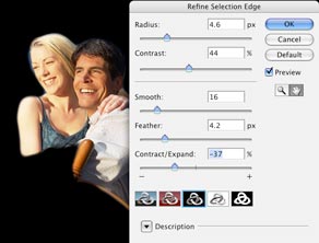 In many of the selection tools including the Quick Selection, the marquee tools and exiting the Quick Mask we can now use the refine edge to get a nice clean edge, eliminating, jaggies, halos and matted edges (think of an extracted layer with a colored outline where it was removed from its background). This works like choking a mask in Channels but much quicker and easier to use.