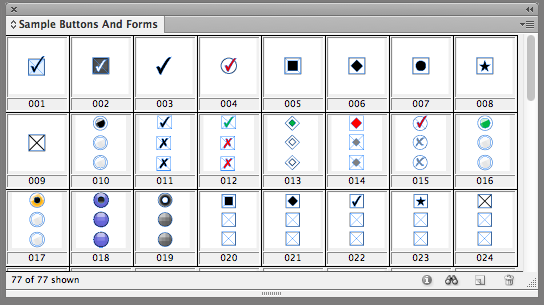 PDF forms fields (checkboxes, text entry fields, and so on) have been a long requested feature and have finally been added to InDesign CS6. The easiest way to try out the new form fields is to switch to the Interactive for PDF workspace. While you are in this workspace, there is a new library panel available under the window menu called “Sample Buttons and Forms”.