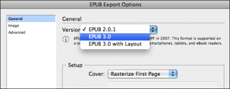 A new dropdown menu in the EPUB Export Options dialog box gives you a choice of export formats: EPUB 2.01, EPUB 3, and an enticingly-named ”EPUB 3 with Layout.”