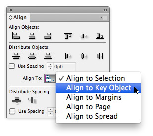 This control, which has previously only been in Illustrator, now makes its debut in InDesign. It allows you to choose which object in your selection you want your other objects to align with. To tell InDesign which object in a multiple selection is the key object, just click it. Its selection border gets an extra hit of pixels, making it easy to spot in a crowd. — KG
