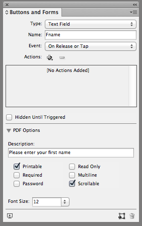 After dragging out these sample form fields into your layout you can edit them with the Buttons and Froms panel (formerly the Button Panel). From here you can modify their attributes like their description, font size, read only and more. If you prefer to create form fields from scratch you can convert any InDesign object into a text field, check box, combo box, radio button, or signature field. If you would like to test your form you will need to export your layout to an interactive PDF since the preview panel has been renamed to the more accurate SWF preview panel.