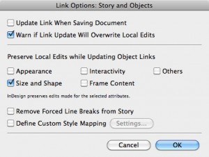 If the story or object becomes out-of-date because its parent has changed its text or appearance, you’ll see a warning triangle. Double-clicking will update the link. Option/Alt-clicking takes you to the Links panel. —Steve