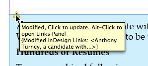 Since linked content is a lot more important in CS6, the application gives you a more obvious way to tell when a story or an object is out-of-date. By default, a linked story or object shows an on-object Link Badge. (If you don’t want to see it, turn it off in View > Extras > Show/Hide Link Badge.)