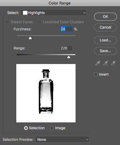 Adjust the Range until you see a nice clean silhouette of the bottle shape (Fuzziness at 0 for now)