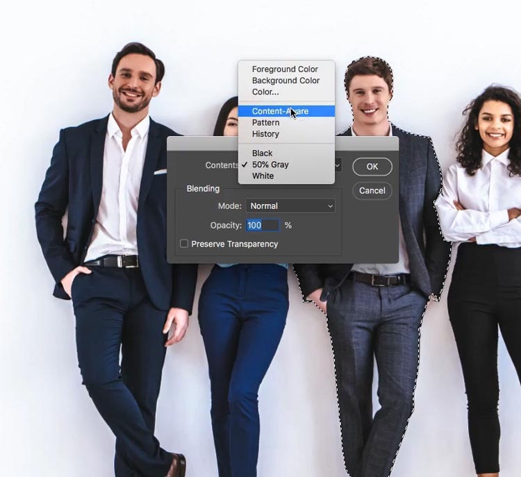 Lets begin with the photo of 4 people, and 4 are about to become 3. The guy on the right is about to get erased.