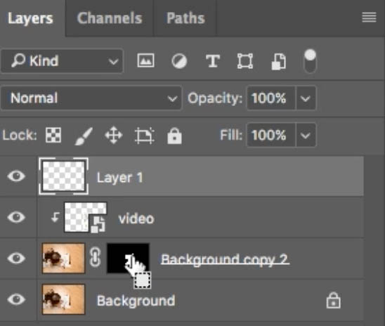 Drag the duplicated smart object out of the video group in the Layers panel. Pull it up until you see the line at the top, release it. Now you’ve got one above the other and we just need to select it in the timeline here and drag it over, so now we’ve got the two stacked above each other.
