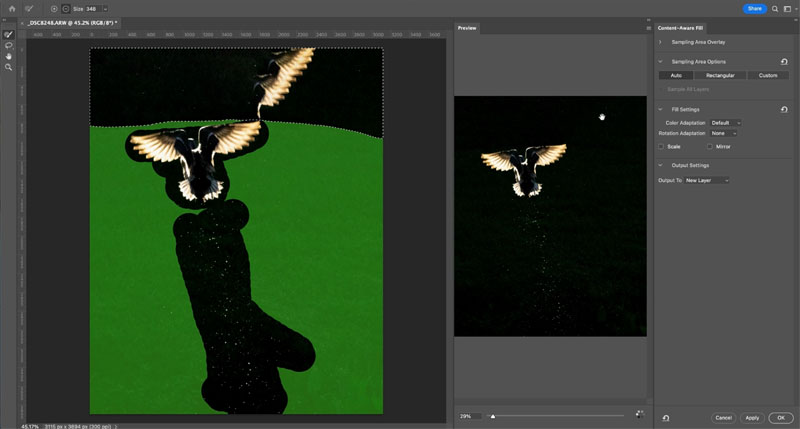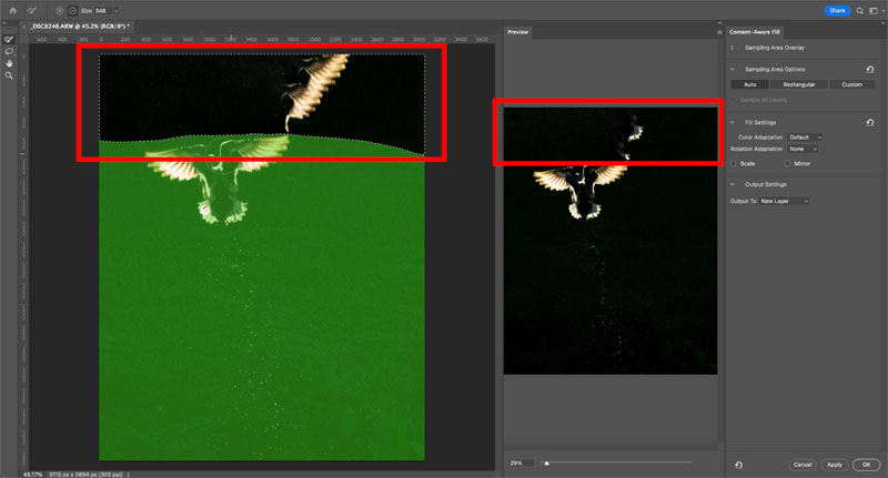 With the brush paint aware the areas that you don’t want used in the content aware fill. In this case, remove the bird and the water splashes.