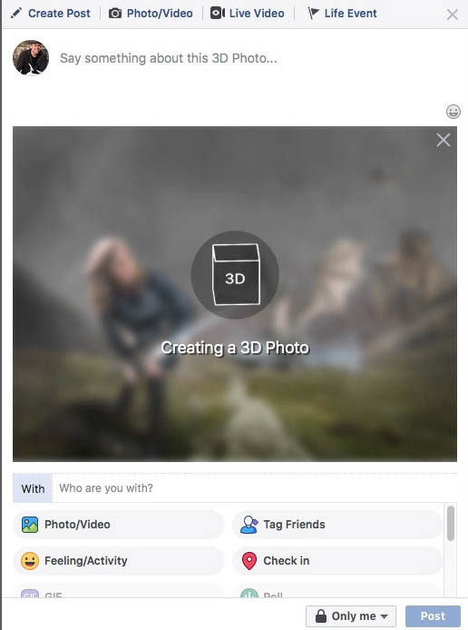 If everything is correct, Facebook will build the 3D image. Make sure the image is less than 4000px at the longest edge (at the time of this writing, I’m sure specs will change over time).
