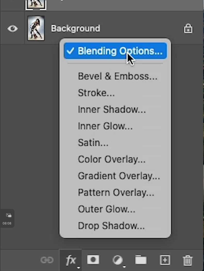 OK, here’s THE trick. Watch what happens when we go down to FX and we’re going to choose blending options under the effects.