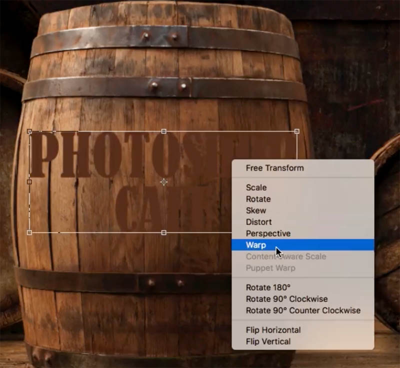 Right click and choose Warp because it enables us to match curves and it works nicely on rounded surfaces. (Now we don’t have to rasterize the type to use warp, but some of the other things we are going to do, we will need the type rasterized).