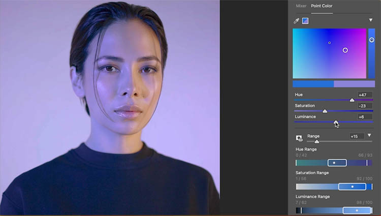 Here is a photo which has a blue light hitting one side. You can also see issues where the strands of hair are casting a different colored shadow. This is an especially tricky image because it also has a strange highlight on the other cheek that looks like a birth mark. we can easily fix all of this using the new Point Color tool.