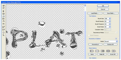 To give the type an enhanced liquid quality, go to Filter>Liquify. Use the Bloat tool to expand or otherwise warp areas of the text as seen here. Once you are happy with the distortions, click OK.