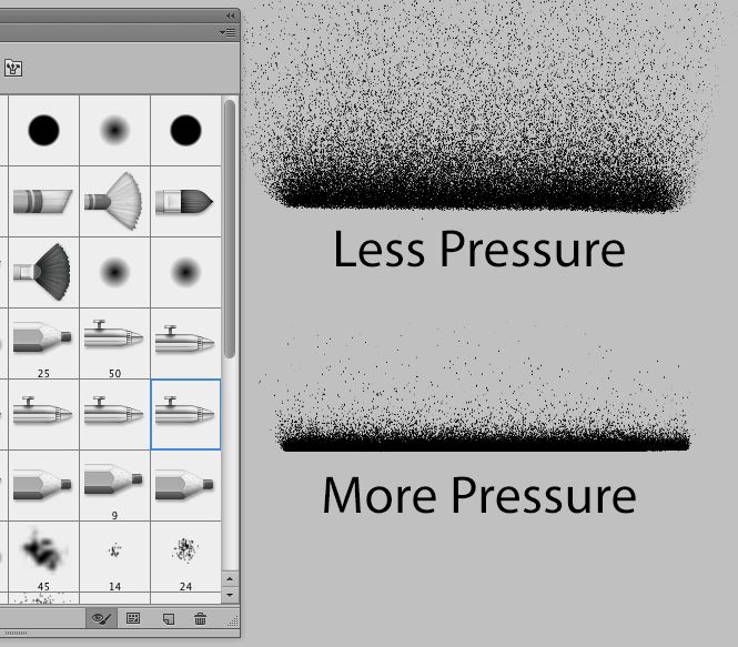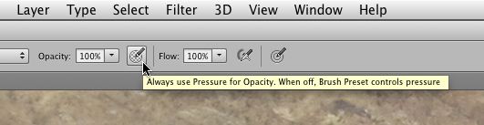 In short, when toggling either (or both) of these buttons to their on, or depressed position, you elect to control the size or opacity of the brush by pen pressure. This method overrides whatever controls have been assigned to a brush preset, meaning when the button is in the off position, pressure is controlled in the Brush Panel. Tip: For general retouching, I often select a basic soft round brush from the brush panel, and then toggle the control of the size and opacity of the brush (tip) using these pressure control buttons.