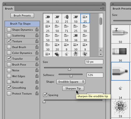 I’ll start with perhaps the most visual enhancement, the introduction of “erodible tips” (as in tips that wear down) and “airbrush tips”. Found in the Brush Presets panel, erodible and airbrush tips can be identified by a profile view of a shaved pencil and a traditional airbrush respectively. The unique characteristics of the erodible tips include the combination of wear and texture as you continue to use them. The result is the appearance of what you would achieve when using traditional soft, dry media. The more you rub, for example a soft pastel pencil, onto a textured surface, the more it would wear down (and build up). Like traditional media, when you need to sharpen a tip you can do so in the Brush Tip Shape pane of the Brush Panel. (That’s a mouth full!)