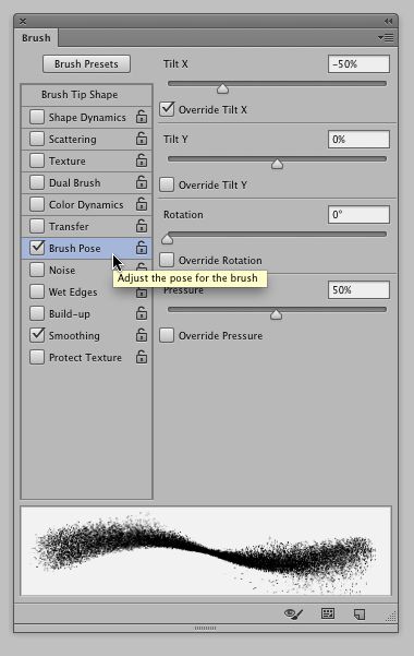 Something else that may grab your attention is an additional pane in the Brush Panel. “Brush Pose” enables you to set stylus parameters for Tilt (X and Y axis), Rotation and Pressure. Enabling these options override any pressure controls assigned in the brush preset. For example, users of an Intuos tablet or Cintiq interactive pen display, whose pen recognizes tilt, may opt to ignore tilt altogether or lock the angle of a brush while drawing. Additionally, users of Wacom’s optional Art Pen (which recognizes tilt, and rotation) can override the rotation of the pen. (For Bristle Tips, Erodible Tips and Airbrush Tips, you can see the effects applied in Brush Pose in the Live Tip Brush Preview. *Bristle Tips were introduced in Photoshop CS5.