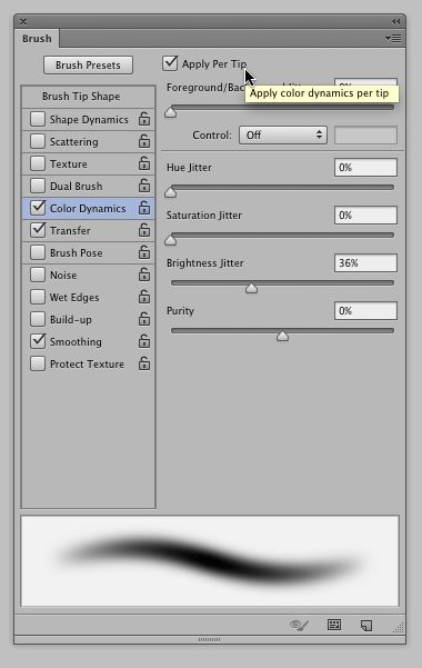 Finally, a notable enhancement in the Brush Panel is the addition of a new option in the Color Dynamics pane. A checkbox now enables you to vary Color Dynamics on a per tip (or stroke) basis. When checked, Color Dynamics behaves as it has in the past. Random colors (between the foreground and background) are across the length of the stroke. Unchecking the box, maintains a constant color per stroke. Each subsequent stroke varies based on the settings in the pane. A nice addition for those looking to add variety to their illustration and design work.