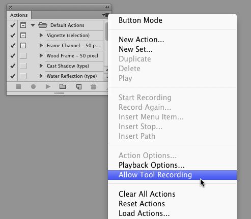To enable the recording of normally non-actionable tools, select the Allow Tool Recording menu option in the Actions Panel fly-out menu. A note on playing back actions that contain brush strokes: When playing an Action that contains brush strokes, keep in mind that the tool used in the original action is honored, however the settings for that particular tool (including brush presets) are not. The brush settings in effect during playback will be used. i.e. Size, color, opacity and more.